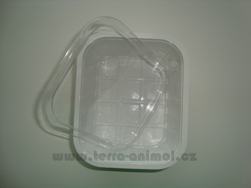 Bílá plastová krabička z potravinářského PVC s transparentním víčkem.